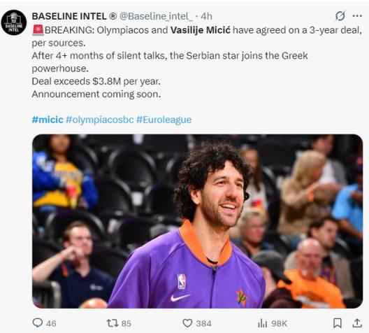米契奇三年合同加盟奧林匹亞科斯,年薪超380萬引熱議