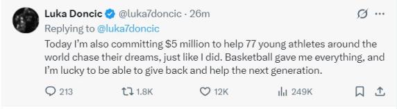 續約后東契奇宣布將捐出500萬美元幫助77位年輕球員追逐籃球夢想,他將努力回饋這個社會幫助下一代的年輕球員。