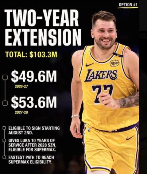 2028年夏東契奇拿完這份合同前兩年的薪水后,他能在2028年夏與湖人簽下一份五年高達4.17億的史詩級頂薪合同,東契奇簽約這份2+1合同的用意應該給也是為此。