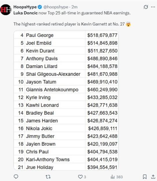 根據美媒Hoops的報道,盧卡在簽下這份三年1.65億的頂薪合同后,他的NBA總收入升至歷史前25位,退役球員中加內特總收入歷史27位是最高的。