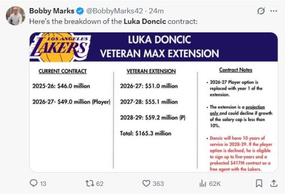 薪資結構專家鮑比-馬克斯透露,東契奇還剩一年4600萬的薪水,26-27賽季會上浮到5100萬,27-28賽季達到5510萬,28-29賽季為5920萬,實際上是三年1.653億的頂薪續約。